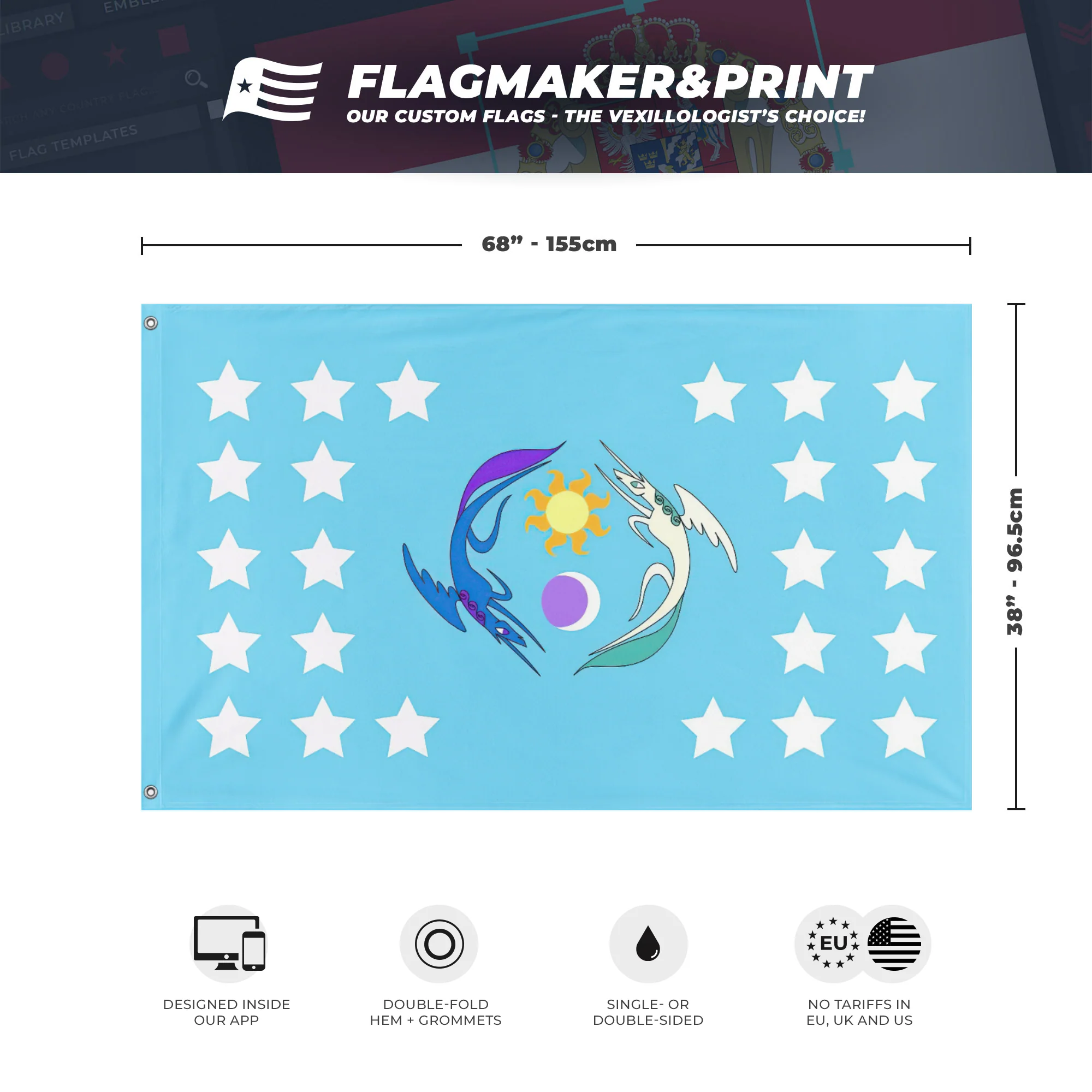🎌 All our flags are 3x5ft, single - or double - sided, grommetted on the hoist side. If you have special requests, don't hesitate to reach out to us via our contact page!