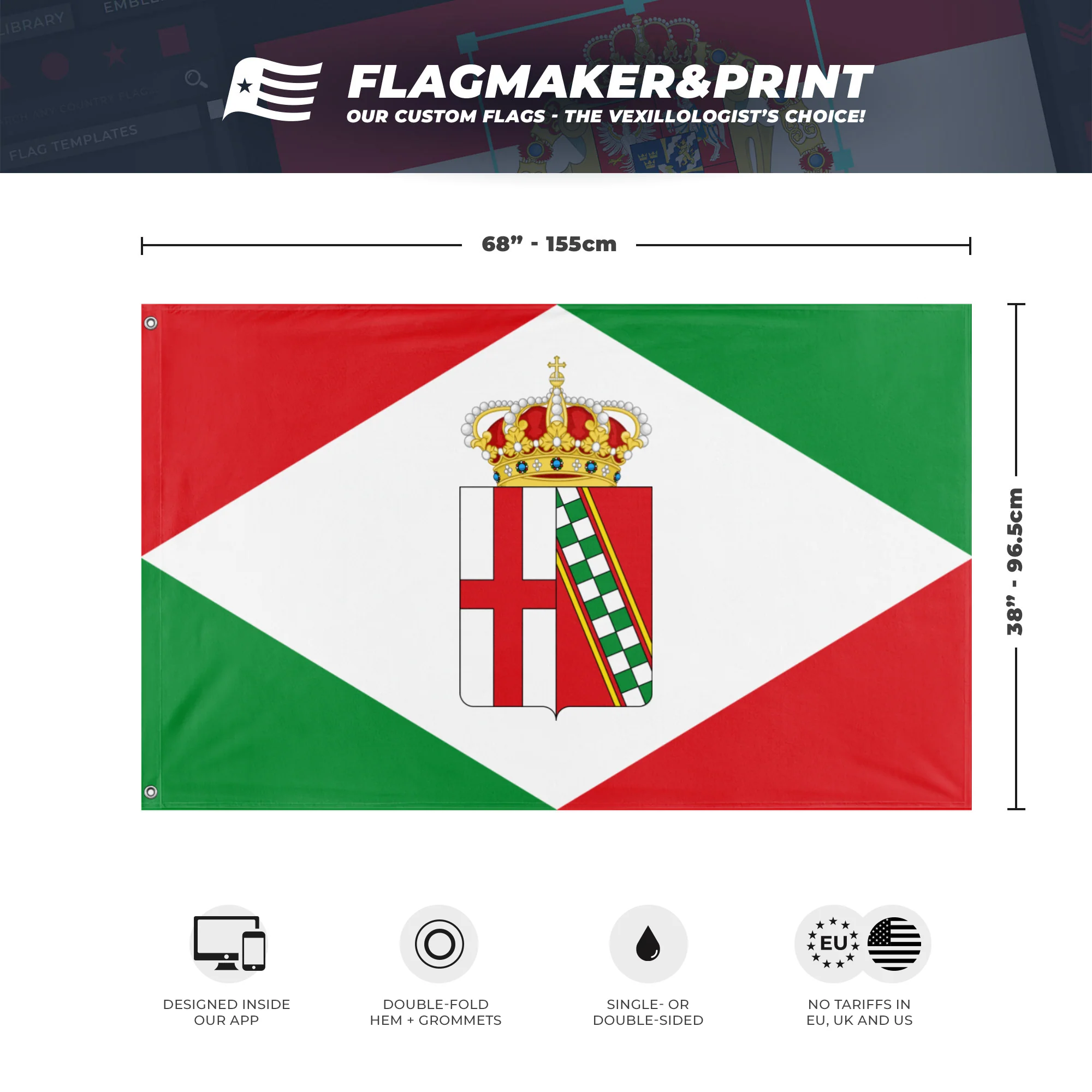 🎌 All our flags are 3x5ft, single - or double - sided, grommetted on the hoist side. If you have special requests, don't hesitate to reach out to us via our contact page!