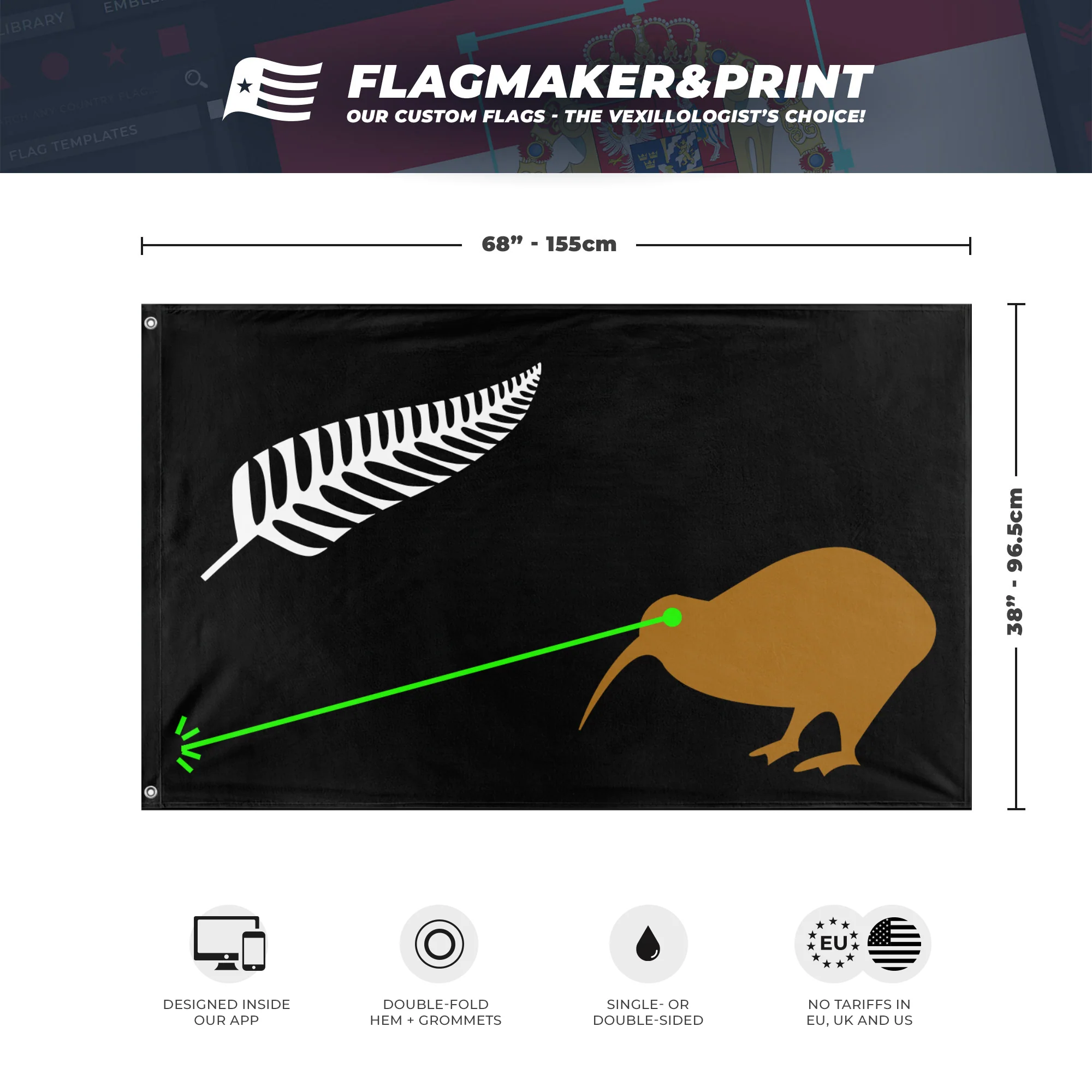 ✒️ The Laser Kiwi flag was created in 2015 by Lucy Gray, a former ACT Party candidate, as a proposed flag of New Zealand. She designed the flag in Microsoft Paint during an evening. Inspired by the many "deadly animals" in Australia, she took a Kiwi icon and turned it into a deadly animal. When the initial four chosen options were released for the first stage of the New Zealand flag referendums, Gray stated that she was "uninspired" by the designs as they "didn't derive much meaning" for her. During the New Zealand flag referendums, the Laser Kiwi flag became a large social media phenomenon and was featured in comedy routines by comedians, such as John Oliver, discussing the flag referendum and New Zealand in general. The flag features a New Zealand fern and a kiwi shooting a green laser beam from its eyes. The description of the flag stated that "the laser beam projects a powerful image of New Zealand. I believe my design is so powerful it does not need to be discussed." It was often joked by comedians that if the flag were to become the official flag of New Zealand, it would cause "fear" in New Zealand's enemies.