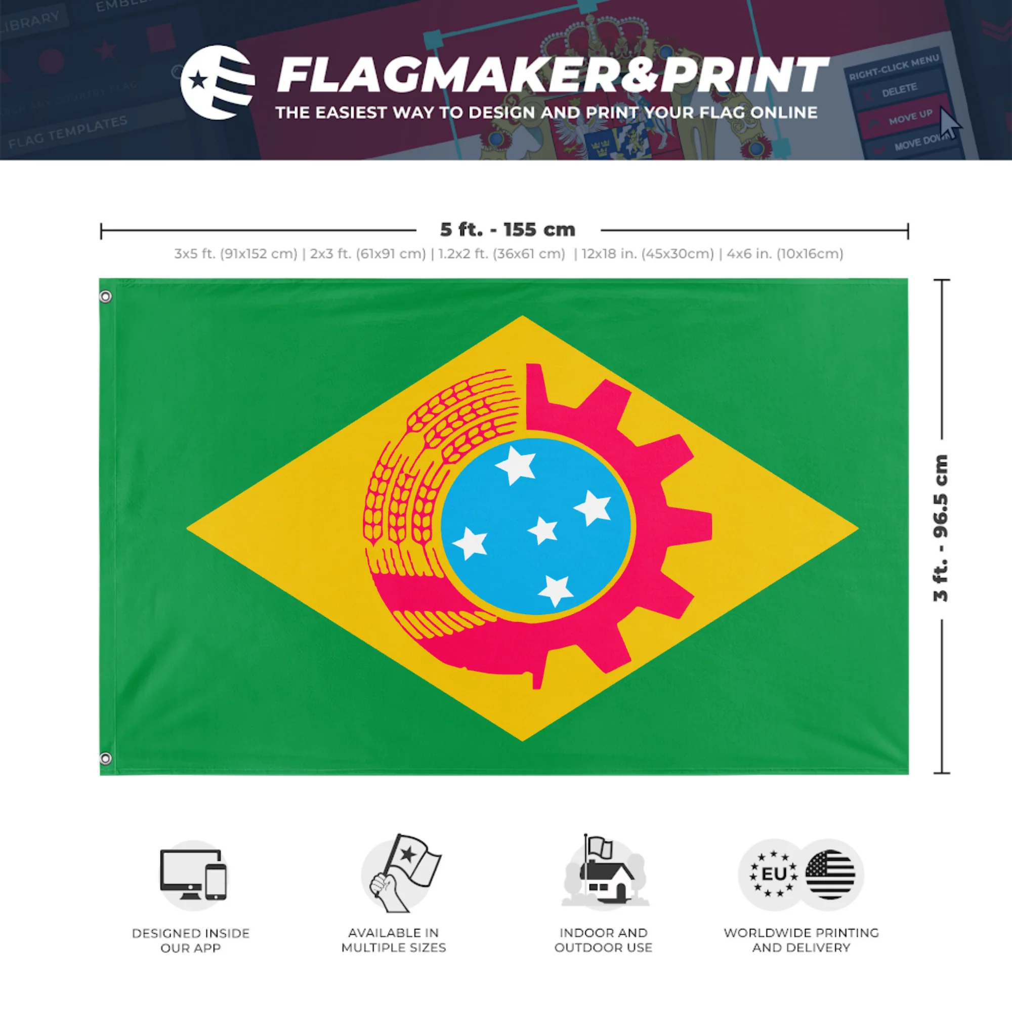 ✒️ The Socialist Brazil Flag is a conceptual reinterpretation of Brazil’s national flag, designed to symbolize socialist ideals such as workers’ rights, economic equality, and social justice. While the official flag features a green field with a yellow diamond and a blue globe depicting the night sky and the national motto “Ordem e Progresso” (Order and Progress), socialist versions often replace the motto with socialist slogans or symbols like the red star or hammer and sickle. The green and yellow may be retained or adapted with red hues to emphasize revolutionary themes. This flag is used by leftist and labor movements in Brazil to express their vision of a more equitable society rooted in socialist principles.